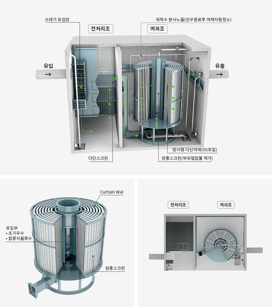 1차스크린 → 중력침전 → 원통스크린 → Curtain Wall (방사형 다단여재)
