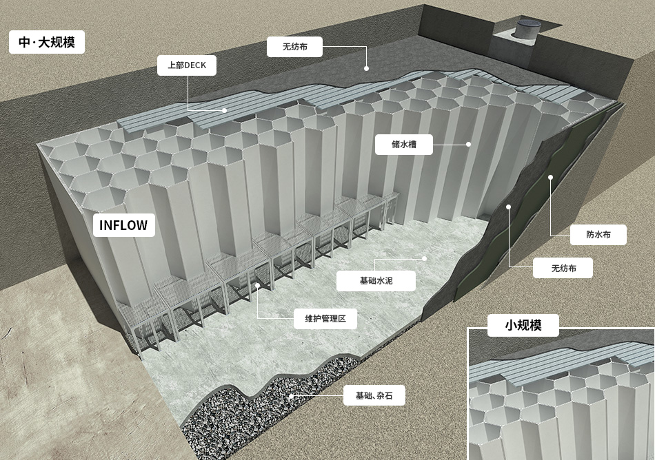 雨水调蓄池可以在暴雨时将大量的雨水暂存于地下,起到防洪效果。同时,也可以在缺水(旱季)时提供储存的雨水。P&I雨水调蓄池施工性出色,采用蜂巢结构,提升了稳定性。