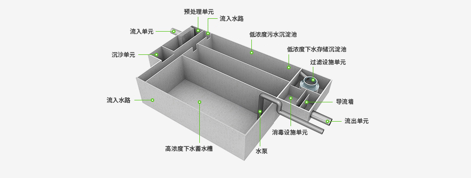 - 储水单元 : 高浓度污水蓄水槽、低浓度下水蓄水槽、沉淀池