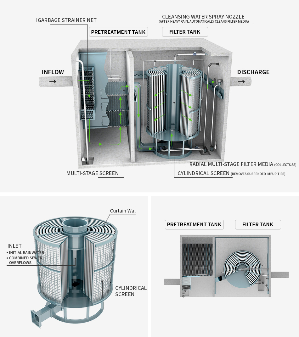 Features the simplicity and economic feasibility of a screen, superb treatment efficiency of filter media, the ease of maintenance unique to a curtain wall.