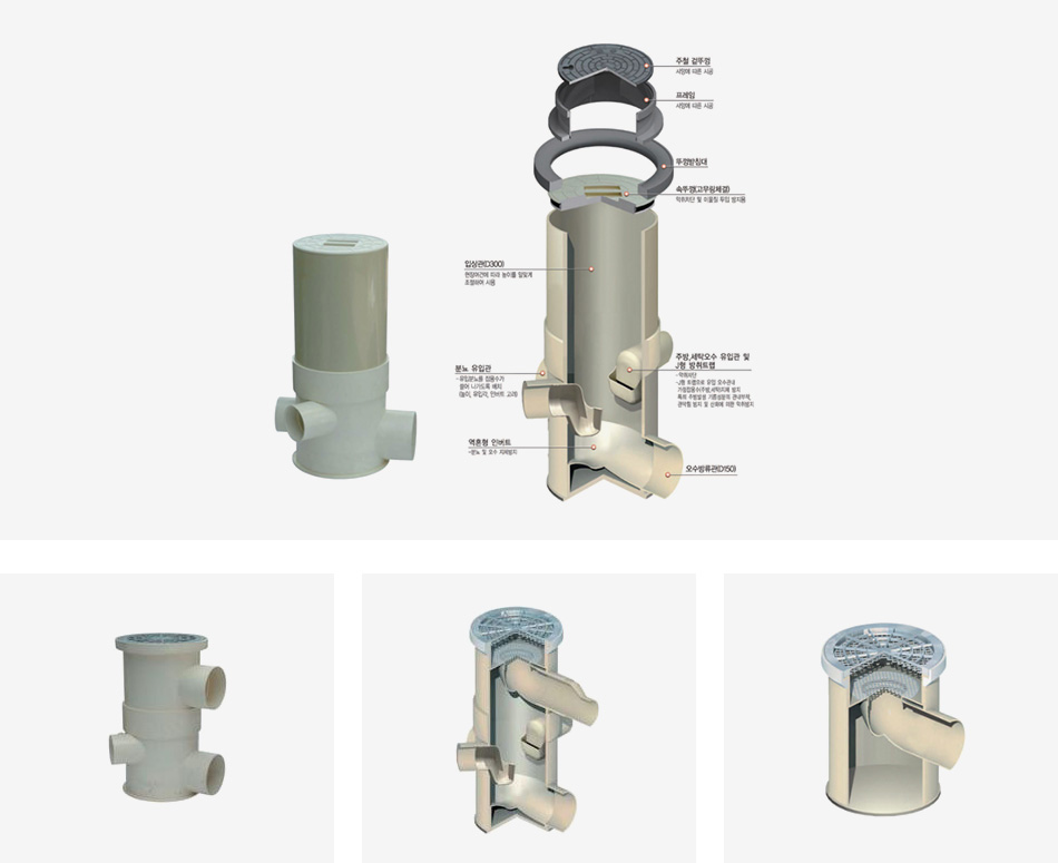 유입부 원형구조로D100m/m의 45° 각도(곡관 절감 및 90°관막힘예방)로 3방향 유입 및150m/m 1방향 유출이 가능한 구조