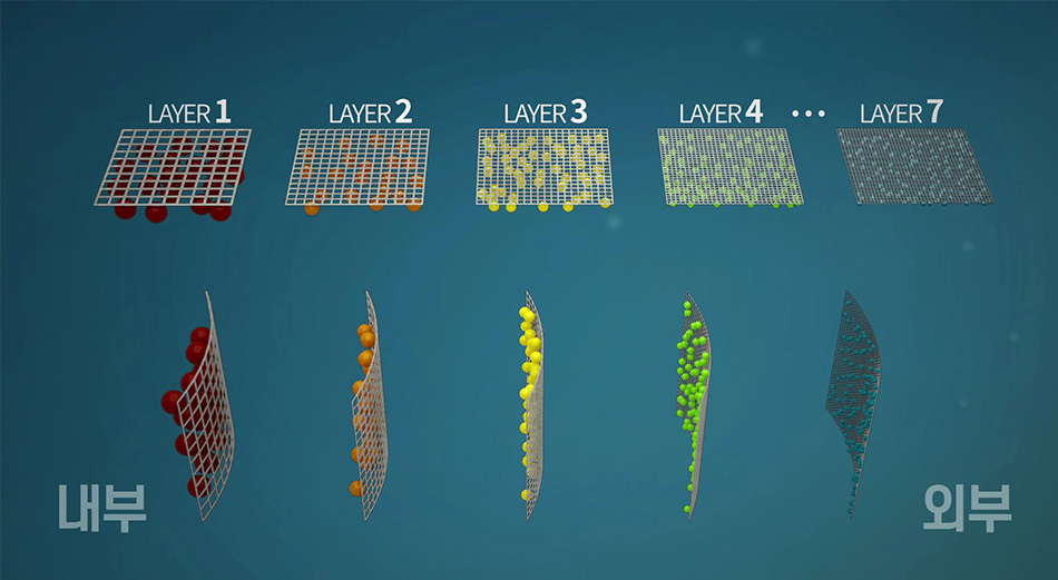 - 유수 단면이 넓어져 유속이 느려지는 가장 자리부에 섬유 여재를 다단으로 형성하여 (Curtain Wall) 오염물질 처리