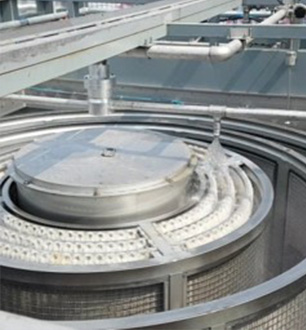 1차스크린 → 중력침전 → 원통스크린 → Curtain Wall (방사형 다단여재)