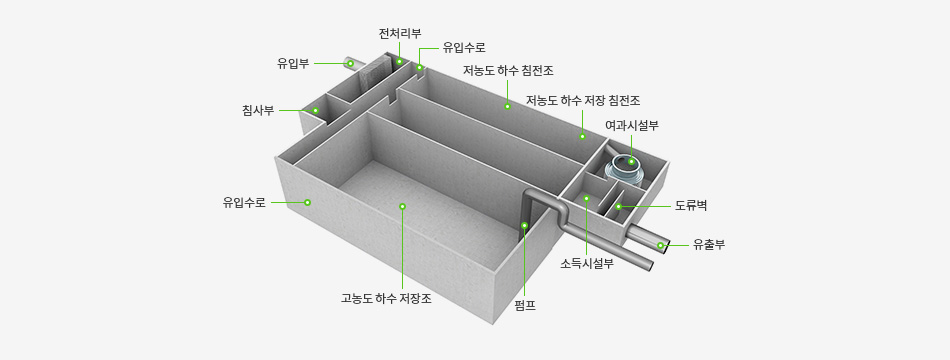 - 저장부 : 고농도 하수 저류조, 저농도 하수 저류, 침전조